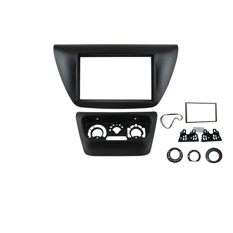 Professional double-DIN facia plate with heater control relocation specifically engineered for Mitsubishi Lancer 2003-2007 compact sedan vehicles enabling seamless installation of aftermarket double-DIN head units into factory dashboard openings. Manufactured from premium high-quality ABS plastic molding with black finish ensuring structural integrity and long-term durability matching factory dashboard materials. The comprehensive kit includes facia panel, trim ring, side brackets, rubber ring seal, and stickers for heater controls for secure installation with relocated climate control functionality. Features OEM design and sizing for perfect fit across Mitsubishi Lancer platform models. Dual internal dimension configuration offers 173mm x 98mm with trim ring or 183mm x 104mm without trim ring accommodating various aftermarket head unit sizing standards including oversized contemporary receivers. Black finish coordinates with Mitsubishi Lancer interior trim maintaining cohesive dashboard aesthetics across compact sedan configurations. Heater control relocation design repositions factory climate controls enabling full double-DIN head unit installation without sacrificing essential vehicle functions. Accommodates various aftermarket receivers including touchscreen navigation systems and Apple CarPlay Android Auto enabled head units providing modern connectivity for compact sedan applications. Precision-engineered for Mitsubishi Lancer eighth generation applications delivering professional installation results maintaining factory appearance quality standards used for fitting double-DIN aftermarket head unit to original enclosure.
