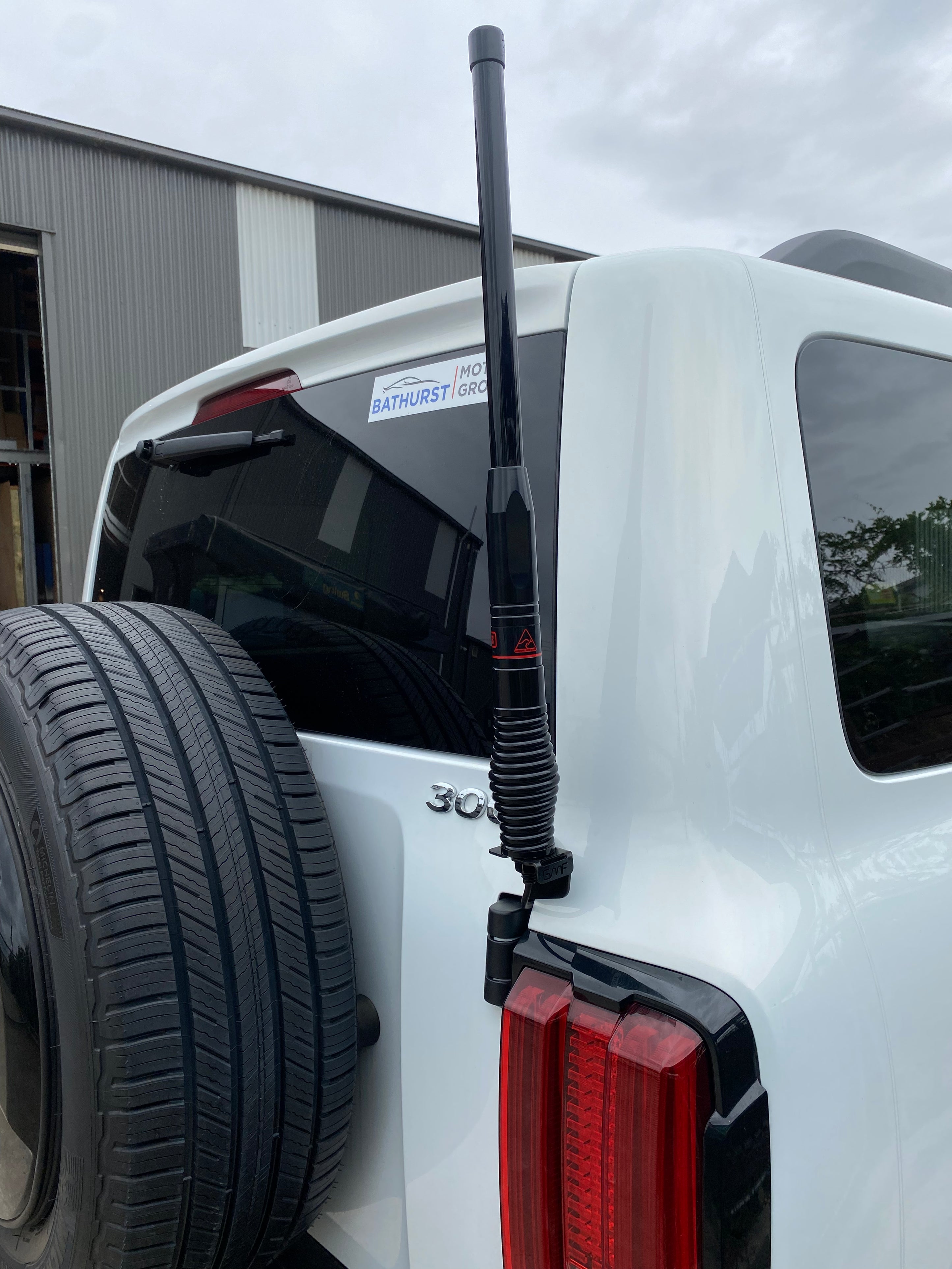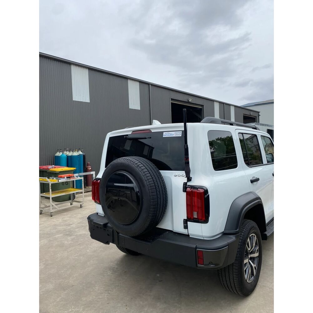 Driver Side Tailgate Boot Hinge Mount: Bolts directly to the driver side boot hinge of the GWM Tank 300, providing a solid and purpose-fitted UHF antenna position at the rear of the vehicle without affecting tailgate operation.