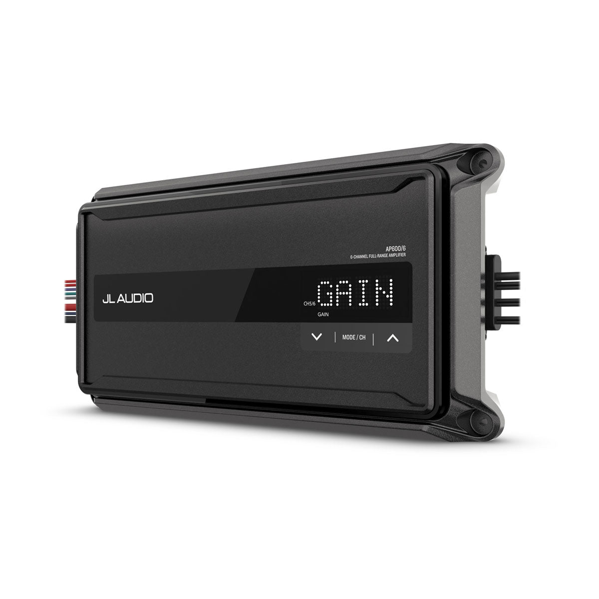 JL Audio JLA-010-03430-00 AP 6-channel compact marine amplifier with IP67 water/dust rating delivering complete system amplification. Combines mid-power four-channel section with high-power two-channel section enabling speakers and subwoofers from single compact amplifier.