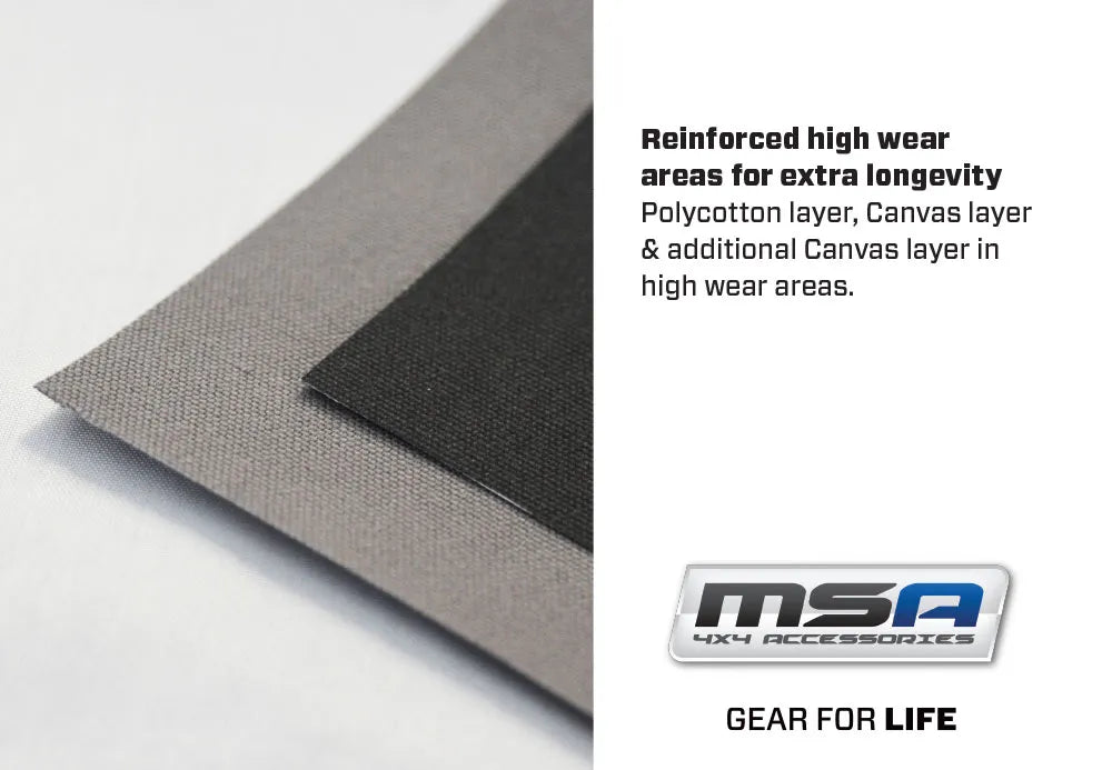 MSA 4x4’s ADR compliant Premium Canvas Seat Covers are designed to provide the most comfortable, best fitting and toughest seat protection for most popular 4x4 vehicle seats. The only Seat Covers with an integrated Air Lumbar Support System and a super soft underside layer of cotton. No rough canvas rubbing the delicate fabric of the vehicle’s original seats, the cotton lining is critical to prevent this. Manufactured from MSA 4x4’s special blend of soft, comfortable canvas combined with DuPont™ 100% waterproof Teflon. Allowing for the greatest level of comfort on long drives while maximising protection from kids and pets. MSA 4x4’s Seat Covers are fully crash-tested and certified ADR compliant. Ensuring the factory airbags will deploy the way the manufacturers intended, by no more than one-thousandth of a second. When it comes to airbags and safety, everything must deploy at the same time.