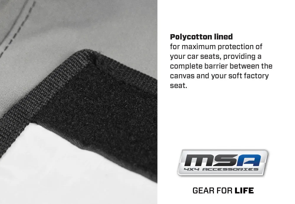 MSA 4x4’s ADR compliant Premium Canvas Seat Covers are designed to provide the most comfortable, best fitting and toughest seat protection for most popular 4x4 vehicle seats. The only Seat Covers with an integrated Air Lumbar Support System and a super soft underside layer of cotton. No rough canvas rubbing the delicate fabric of the vehicle’s original seats, the cotton lining is critical to prevent this. Manufactured from MSA 4x4’s special blend of soft, comfortable canvas combined with DuPont™ 100% waterproof Teflon. Allowing for the greatest level of comfort on long drives while maximising protection from kids and pets. MSA 4x4’s Seat Covers are fully crash-tested and certified ADR compliant. Ensuring the factory airbags will deploy the way the manufacturers intended, by no more than one-thousandth of a second. When it comes to airbags and safety, everything must deploy at the same time.