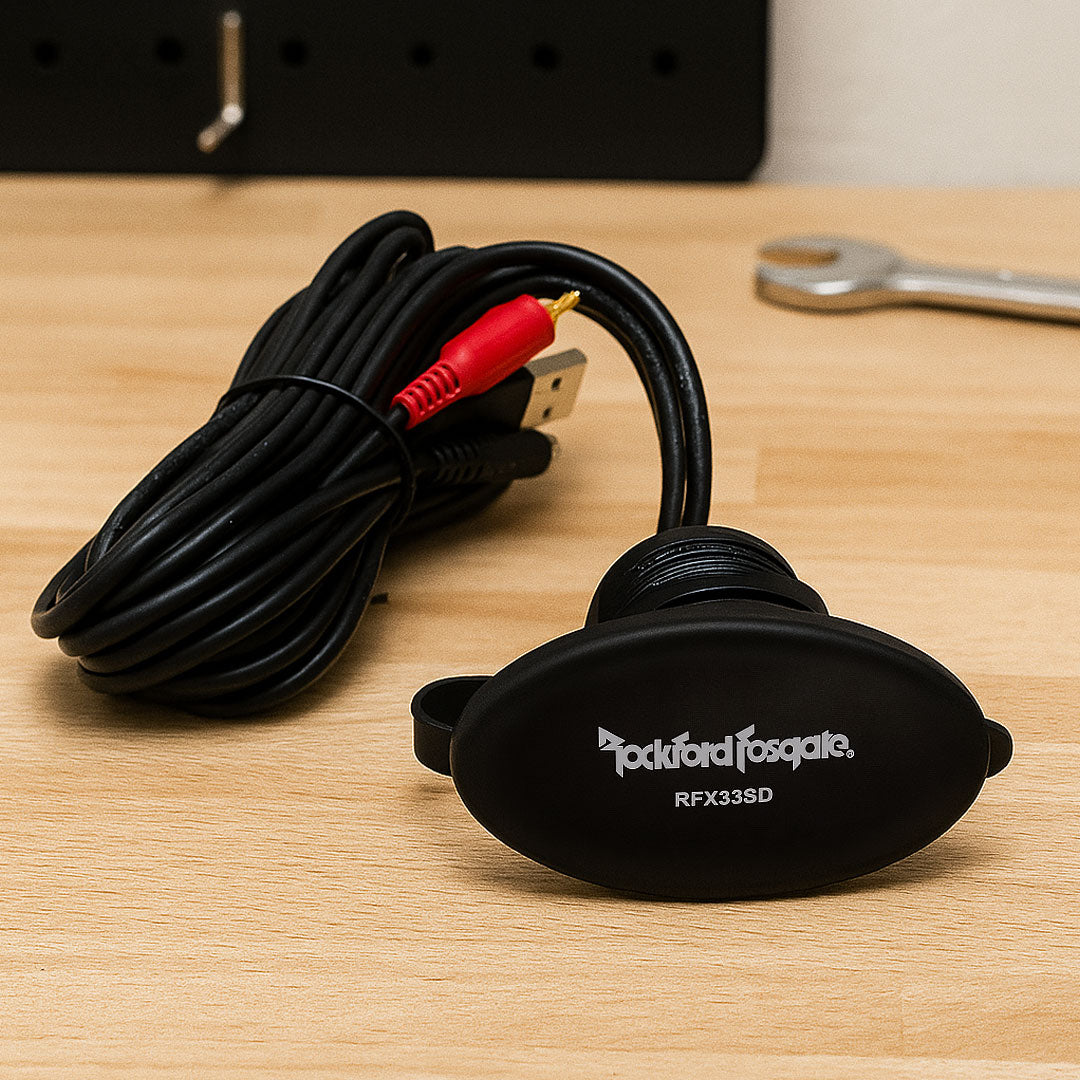 The Rockford Fosgate RFX33SD is a weatherproof remote media input panel designed specifically for marine applications. This mountable unit gives you easy access to USB, SD card, auxiliary, and iPod inputs while keeping connections protected from the harsh marine environment with its durable cover.