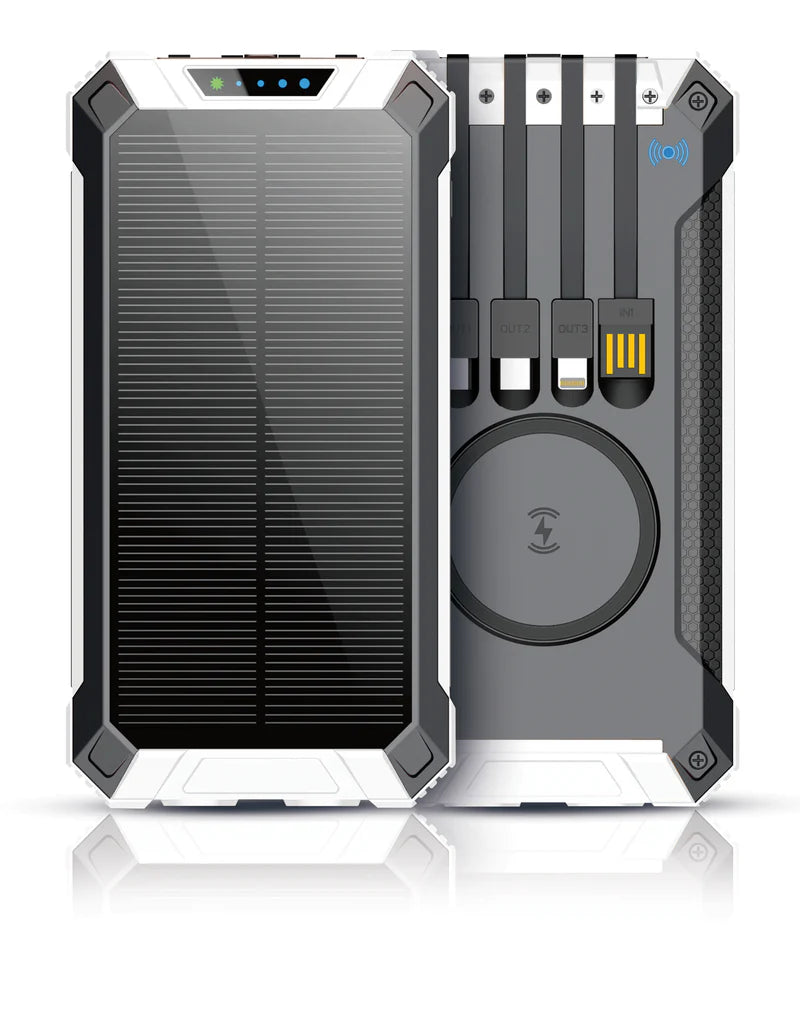 A: Yes! The UPP200S supports pass-through charging - you can recharge the power bank via USB input or solar panel while simultaneously charging connected devices through built-in cables, ports, or wireless charging pad. This is convenient for overnight charging or when you need to charge devices but power bank isn't fully charged.